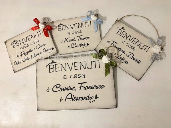 Targa in legno con effetto shabbato sfondo avorio , con scritta "Benvenuti a casa di … " oppure con i cognomi o testo a scelta, personalizzabile nei colori, nelle misure e nella grafica. Decorazione con nastro in juta ,raso o organza, fili, spago e gessetto profumato a scelta tra diversi soggetti. Possibilità diversi tipi e colori di nastri assortiti secondo disponibilità. Misura cm 20 × 15. Richiedi un ordine personalizzato per avere un prodotto creato esclusivamente per te.